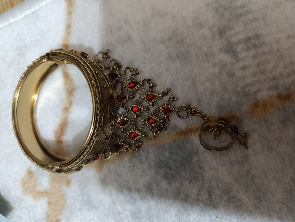 Bohem tarzda, kırmızı işlemeli desenlere sahip detaylı altın zincirli kadın el zinciridir. Düğünler için uygundur. ✨kullanılmamıştır