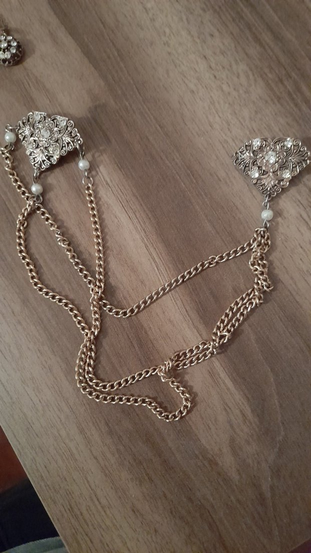 Bej işlemeli detaylara ve parlak zincirlere sahip vintage tarzı vücut zinciri, düğünler için uygundur. Zarif işlemeler ve zincirler klasik bir görünüm sunar.