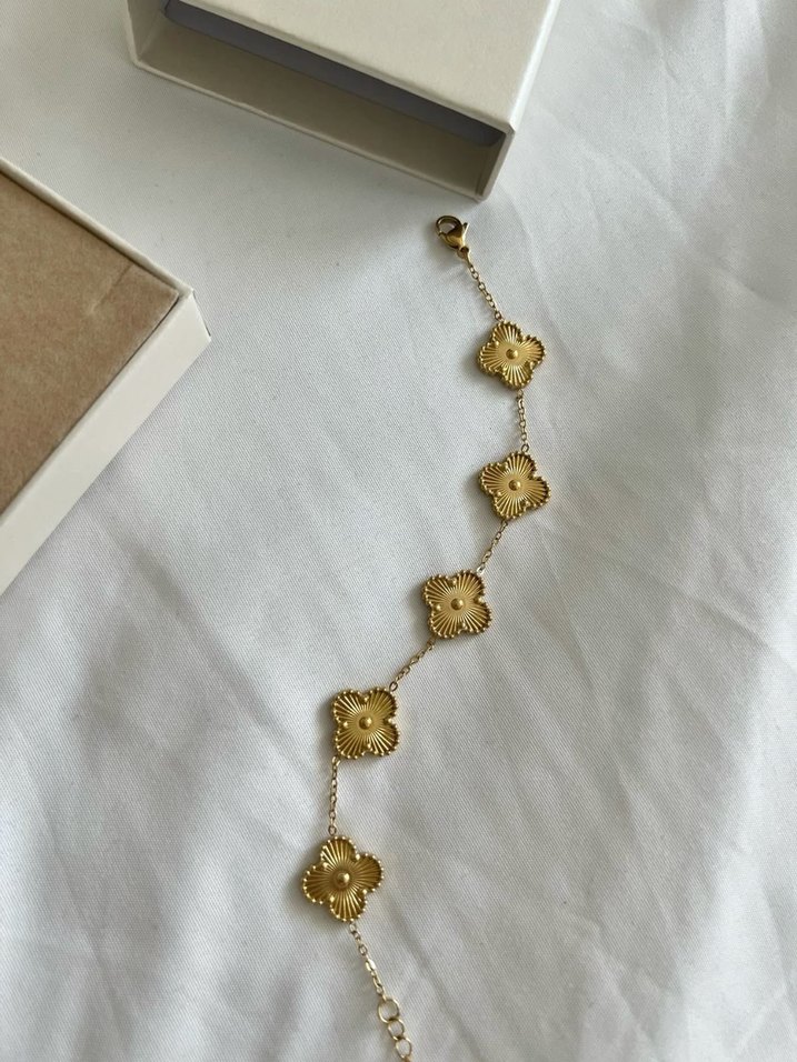 Altın renginde, zincir detaylı ve işlemeli yonca desenli bileklik. Minimalist ve bohem tarzı günlük kullanıma uygun şekilde birleştirir.