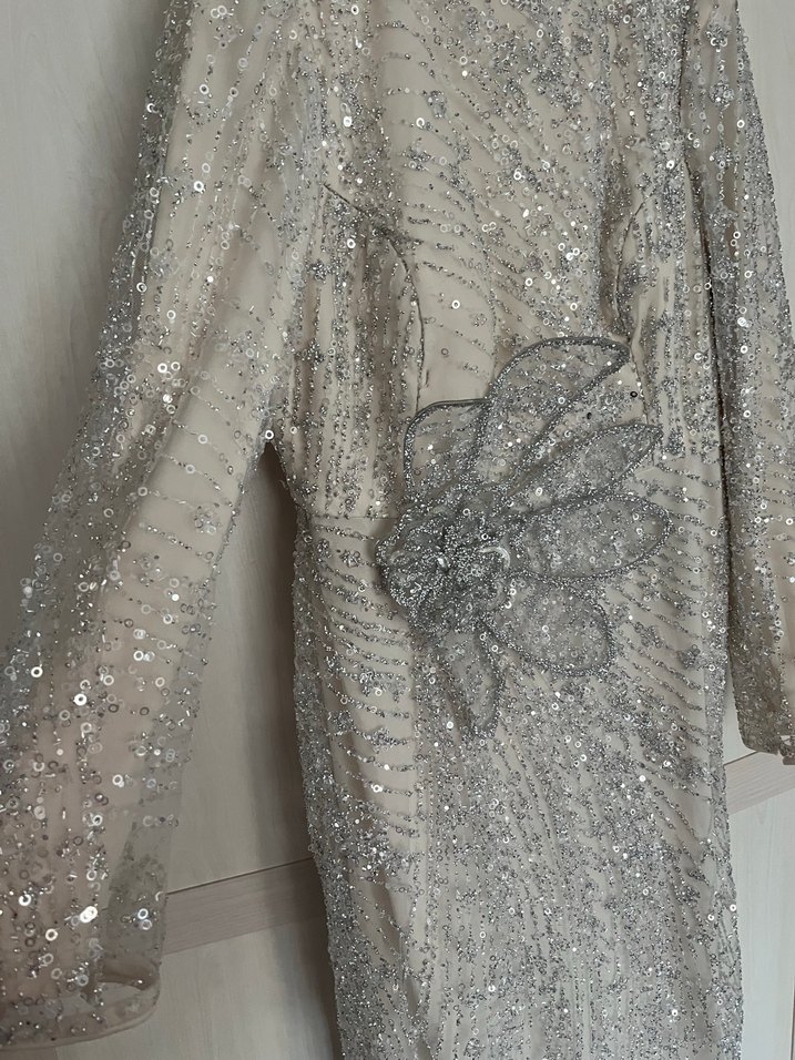 Drapeli ve işlemeli detaylara sahip, uzun kollu, notalı yakalı, bohem tarzda gri uzun elbise, düğün için şık ve avant-garde bir seçenek. ✨
