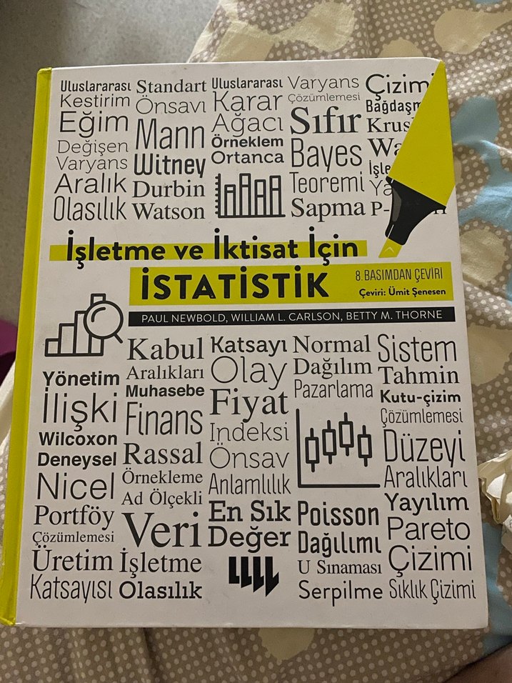 İşletme ve iktisat alanında hipotez testi, olasılık ve veri analizi gibi istatistiksel konuları içeren bir kitap. Bir sayfasında cicek kurutmaya çalıştığım icin boyle bi sey var