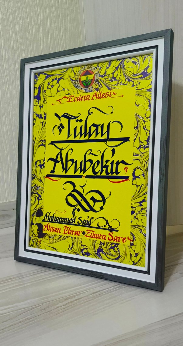 TARAFTAR ruhunu evinin en güzel köşesine taşımaya ne dersin? 26x34.5 cm boyutlarındaki bu özel çerçeveli tabloları, usta işi kaligrafi sanatı ile kişiselleştiriyoruz. ✨ Neden Bu Tablo? Tamamen Size Özel: İstediğiniz ismi veya anlamlı bir notu profesyonel kaligrafi ile yazıyoruz. Mükemmel Hediye: Sevdiklerinize "en asil" hediyeyi vermenin en zarif yolu. Kalite Garantili: Şık çerçevesi ve estetik tasarımıyla beğenme garantili! Kendine bir ödül ver ya da en fanatik arkadaşını mutlu et!