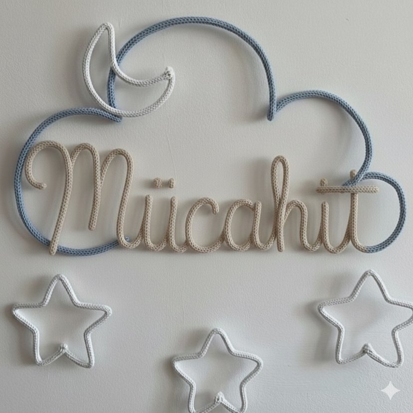 Gri ve beyaz renklerde, yıldız ve bulut şekilli nakışlı örgü çocuk duvar süsü, isme özel hazırlanır #markatemsilidir #elemeği #kapısüsü #duvarsüsü #bebekodasi #bebekhediyesi