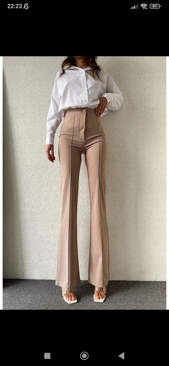 Düğmeli, bej renkli kadın kumaş pantolon, normal boy ve regular fit kesime sahiptir. Sentetik kumaştan üretilmiş, pastel tonlarda ve desensizdir. İş ortamı için uygundur.