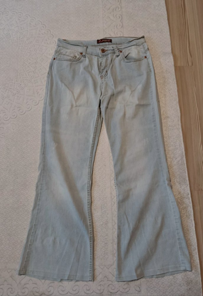 İspanyol paça kesim mavi düşük bel vintage kadın kot pantolon. midi boyda, denim kumaştır çok iyi durumda hiç bir defosu yoktur.