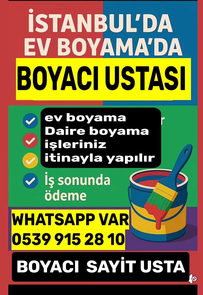 İstanbul'da ev ve daire boyama işleri itinayla yapılır, iş sonunda ödeme alınır. WhatsApp ile 0539 915 2810 numarasından ulaşılabilir.
