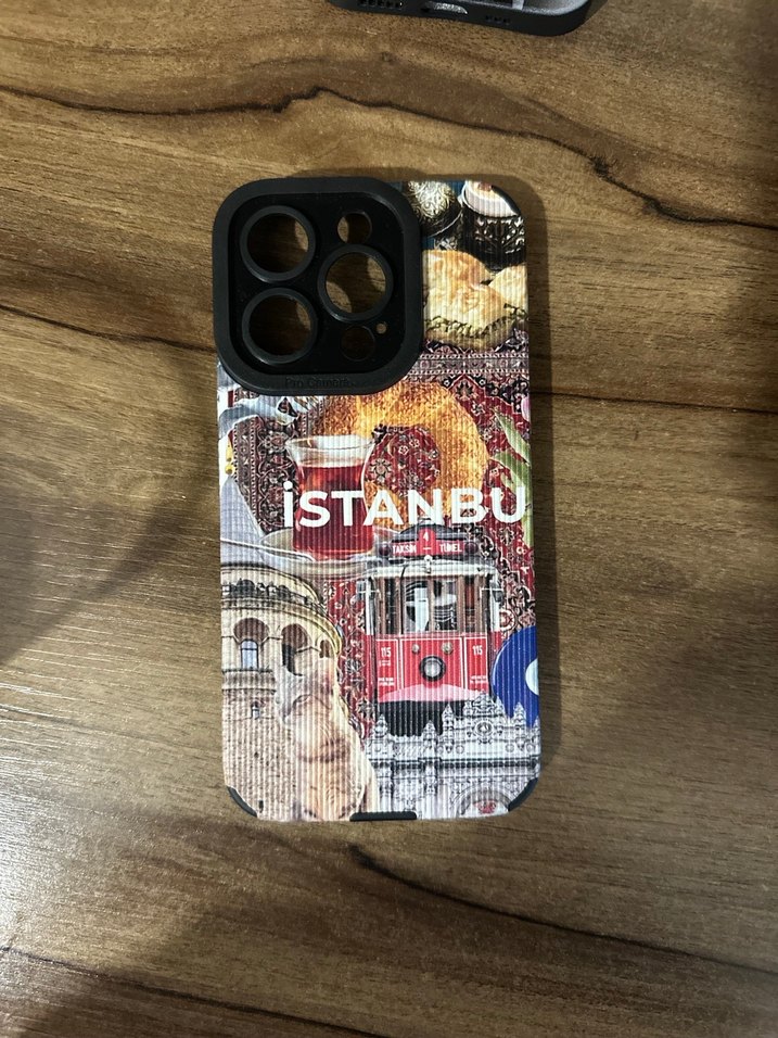 İstanbul temalı, koyu çok renkli telefon kılıfı, canlı karşı kültür tarzında. İPhone 14pro uyumlu