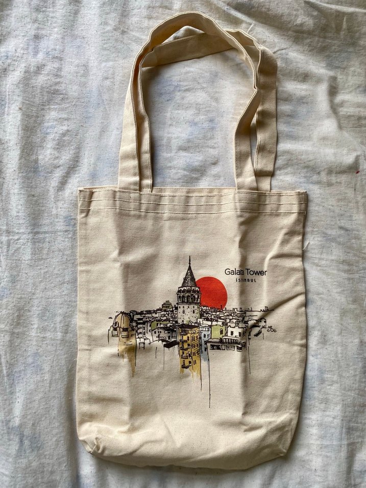 Kumaş malzemeden yapılmış, baskılı şehir manzarası ve kırmızı güneş detayıyla bej renginde tote bag. Hiç kullanılmadı