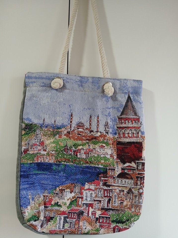 Dükkanımızı kapattık kalan ürünleri satıyoruz. ÜRÜN YENİDİR. Boy: 41 cm En:33 cm Çanta ağız kısmı bir adet mıknatıslı. İçi bez astar. İstanbul şehir manzaralı çanta, bohem tarzı ve detaylarıyla günlük kullanım için uygundur.