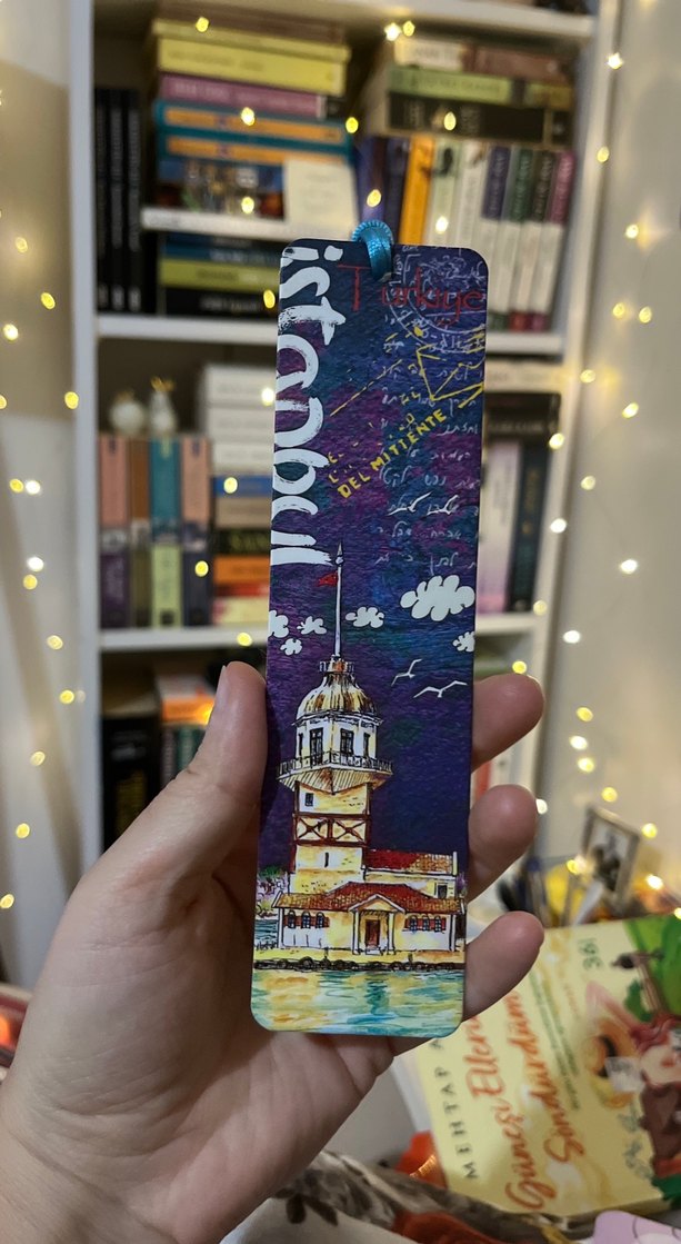 İstanbul'un Kız Kulesi'nin sanatsal çizimiyle renkli bir kitap ayraç. Sanat kitabı tutkunları için ideal.