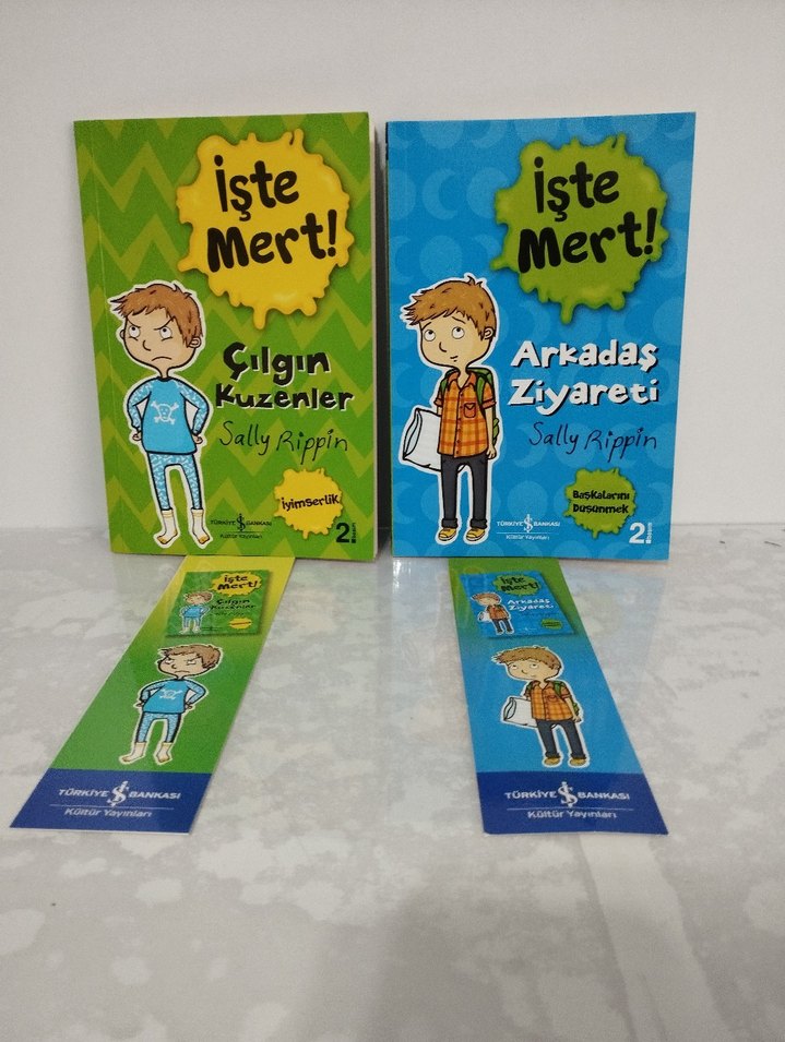 Sally Rippin'in "İşte Mert!" serisinden iki çocuk kitabı. Renkli kapaklar ve ayracıyla, kuzenler ve arkadaş ziyareti temalı.