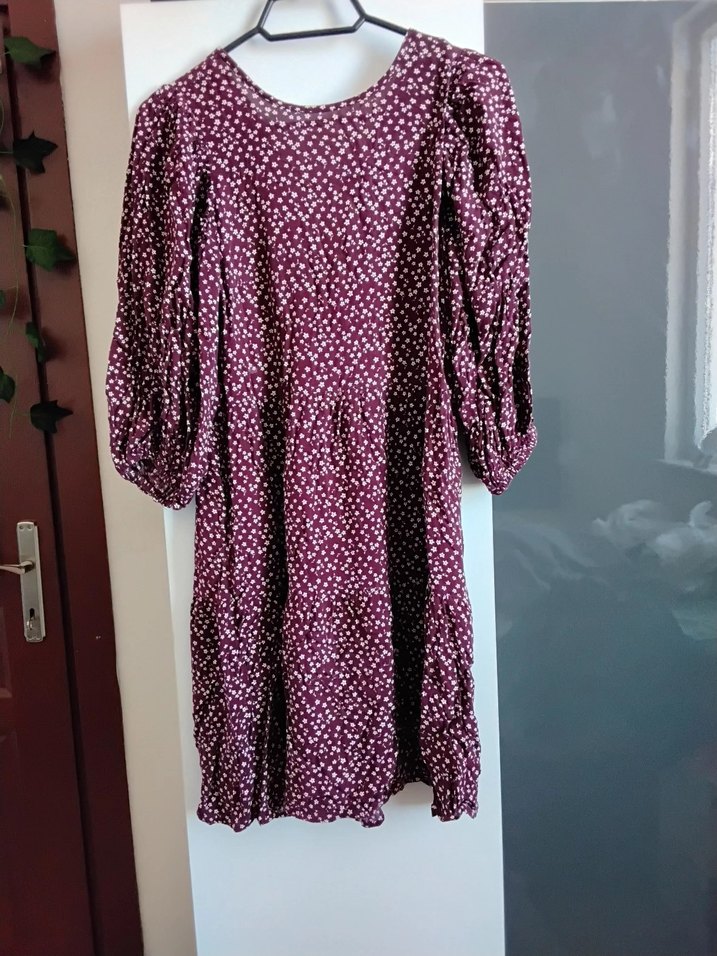 Bordo midi elbise, bol kesim, ve fırfırlı detaylara sahip. Pamuk kumaştan, V yakalı ve hafif batik desenli, bohem tarz için uygun.