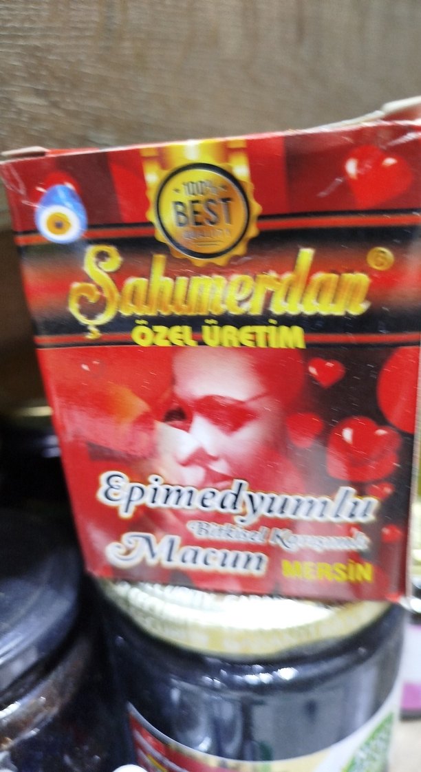 Şahumerdan markasına ait özel üretim, epimedyumlu macun, Mersin ürünü, kırmızı kutuda ve kalp desenleriyle sunulmuştur.