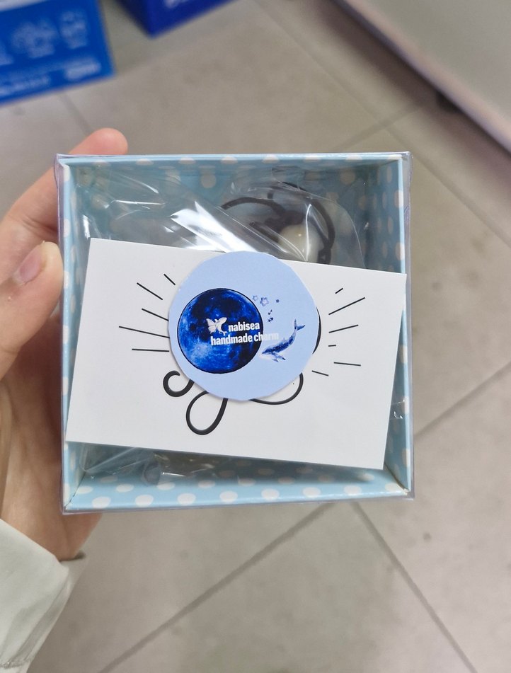 Pastel mavi renkte, şık tasarımlı akıllı bileklik. El yapımı charm etiketiyle süslenmiş kutuda sunulur.