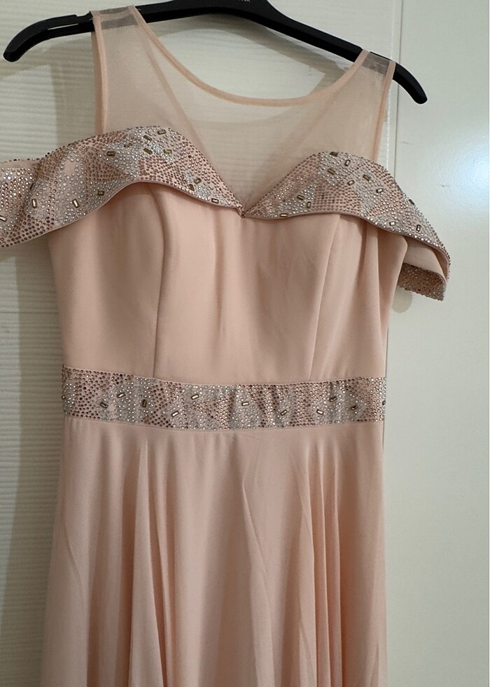 Bir kez giyildi. Kusuru yoktur. Kuru temizleme yapışmamıştır. Fiyatı ona göre ayarlanmıştır. 55 kilo giyilmiştir. Rengi somon rengidir. Seçeneklerde olmadığı işin ten seçilmiştir