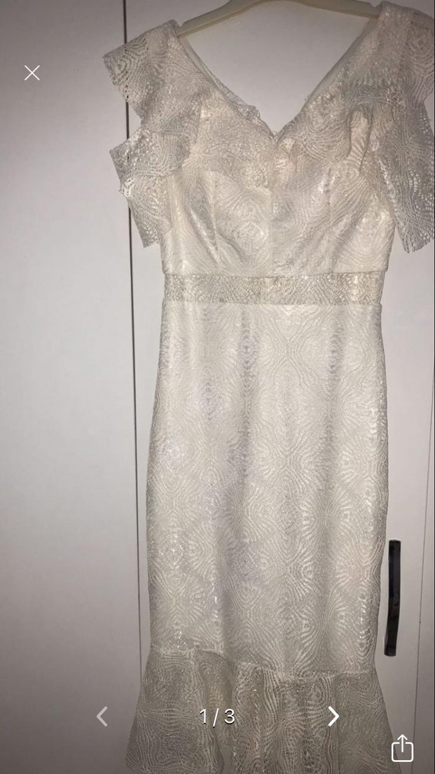 V yaka, dantel işlemeli beyaz, uzun ve vücuda oturan abiye elbise. Kolsuz tasarım, modern klasik ve vintage şıklığı bir arada sunar. Düğün için uygun.