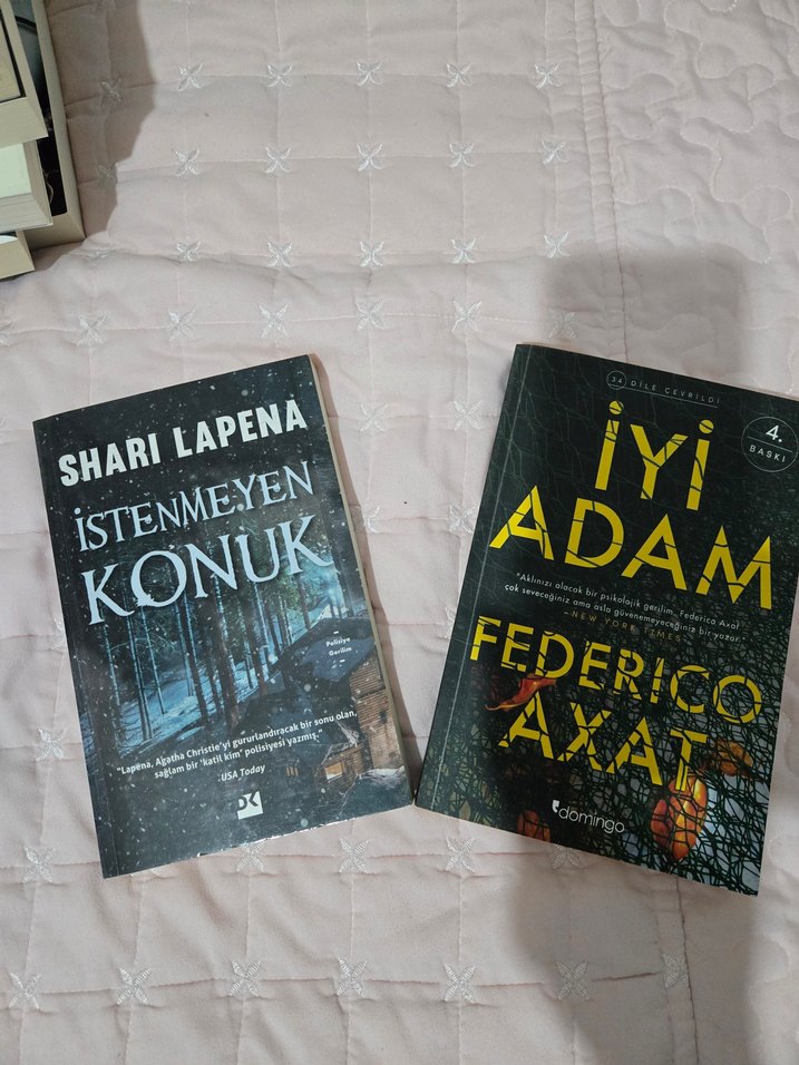 Shari Lapena'nın "İstenmeyen Konuk" ve Federico Axat'ın "İyi Adam" romanları açık renkte bir zeminde yer alıyor. Her iki kitabın kapakları koyu temalıdır.