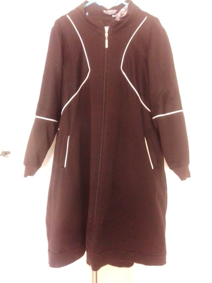 Yumuşak kumaştan yapılmış, fermuarlı, uzun kollu, kahverengi ve bol kesim kadın kaban. Notlu yakalı ve günlük sokak stili için uygun.