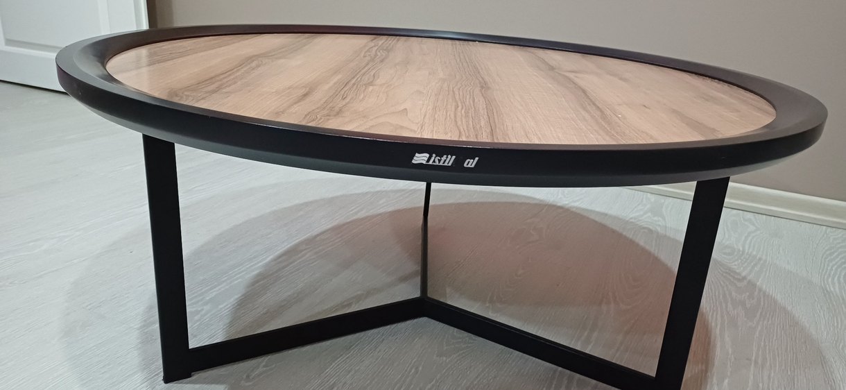 Bej renkli yuvarlak sehpa, koyu metal ayaklar istikbal marka bir ürün