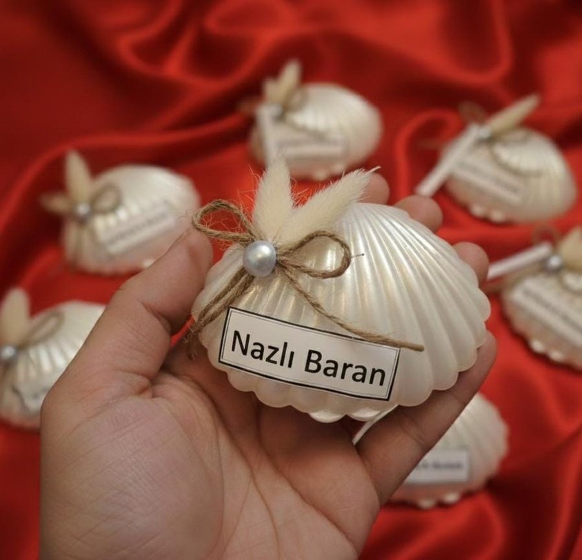 inci detaylı ve rustik ip fiyonkuyla süslenmiş beyaz istiridye mum. Üzerinde baskılı kişiye özel isim etiketi bulunur. Bohem düğünler için uygun.