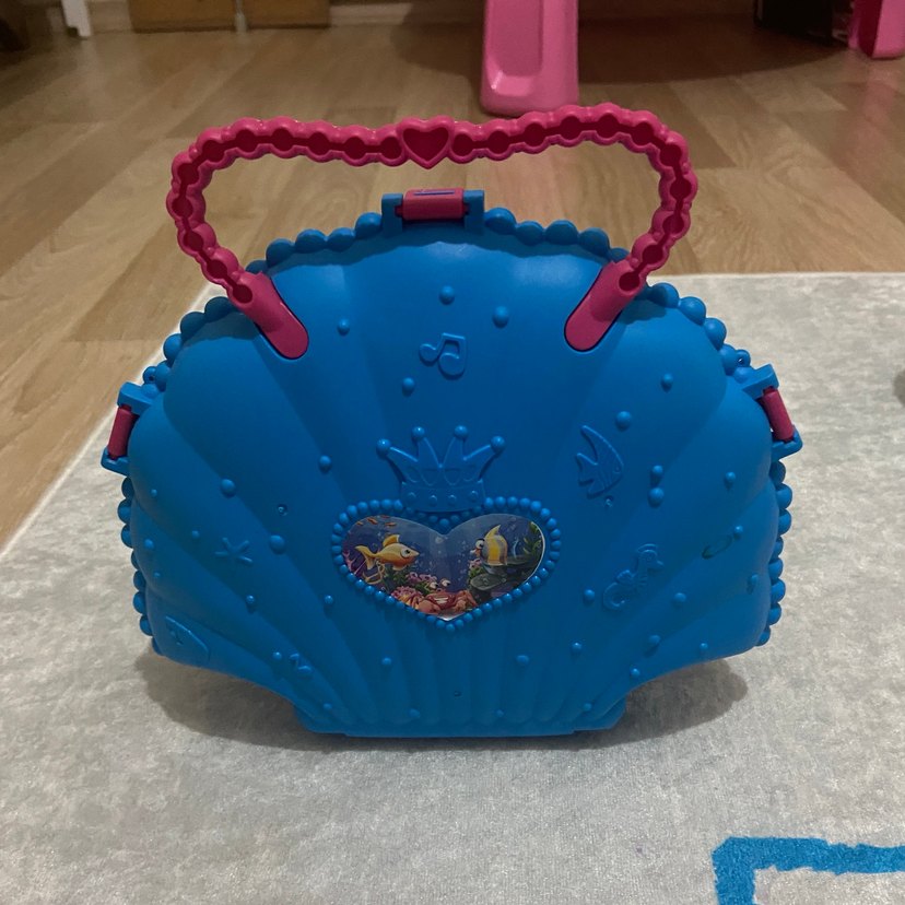 Renkli mavi bebek çantası, kalp şeklinde pencere ve denizaltı balıkları baskısıyla süslenmiştir. Pembe kalpli sapı vardır.