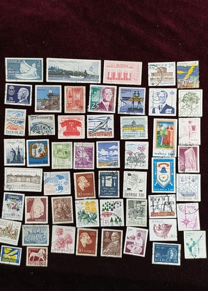 Birbirinden farklı 50 Adet, Damgalı tertemiz İsveç Posta Pulları Koleksiyonu.