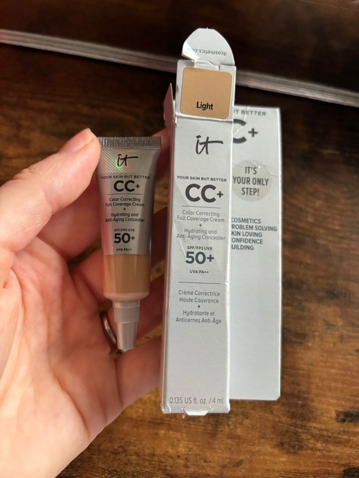 It CC+ Renk Düzeltici Krem Açık Bej, SPF 50+ koruma sağlar. Tam kapatıcılık, nemlendirme ve yaşlanma karşıtı etkiler sunar.