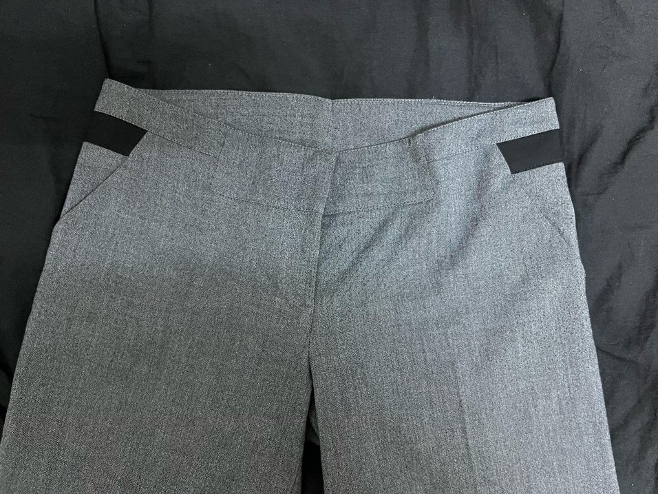 Düğmeli kapamalı, gri renkte düşük bel bol paça kadın kumaş pantolon. pamuklu kumaştadır. ofis kullanımı için uygun, sade ve çağdaş tasarımda. M-L uyumlu