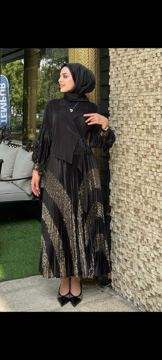 ital Siyah renkte, piliseli ve uzun kollu, elbise. Notlu yaka ve yumuşak sentetik kumaştan üretilmiştir.