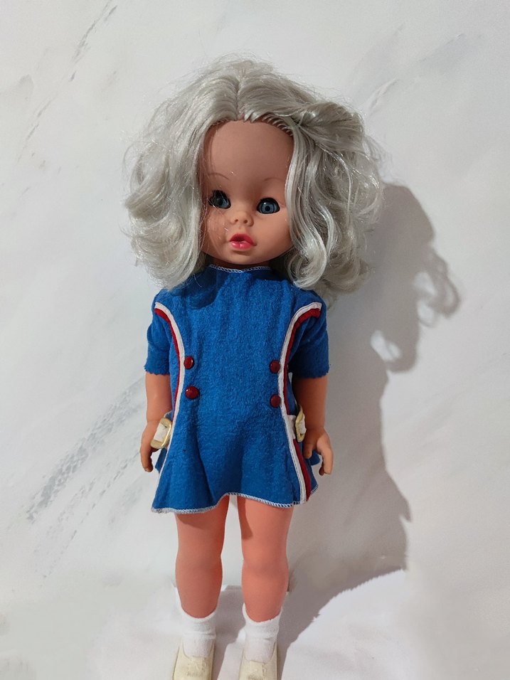 47 cm Orijinal Kiyafetleri Gri saçlı, mavi elbiseli ve kırmızı-beyaz detaylı oyuncak bebek. Mavi gözlü ve beyaz ayakkabılıdır.