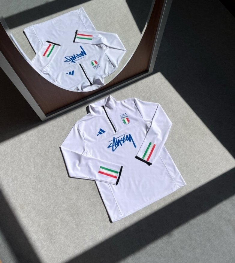 Beyaz renkli, fermuarlı, uzun kollu erkek spor forması. Sentetik kumaştan, baskılı renkli detaylara sahip, kısa kesim ve dar kesim. ⚽tüm bedenler