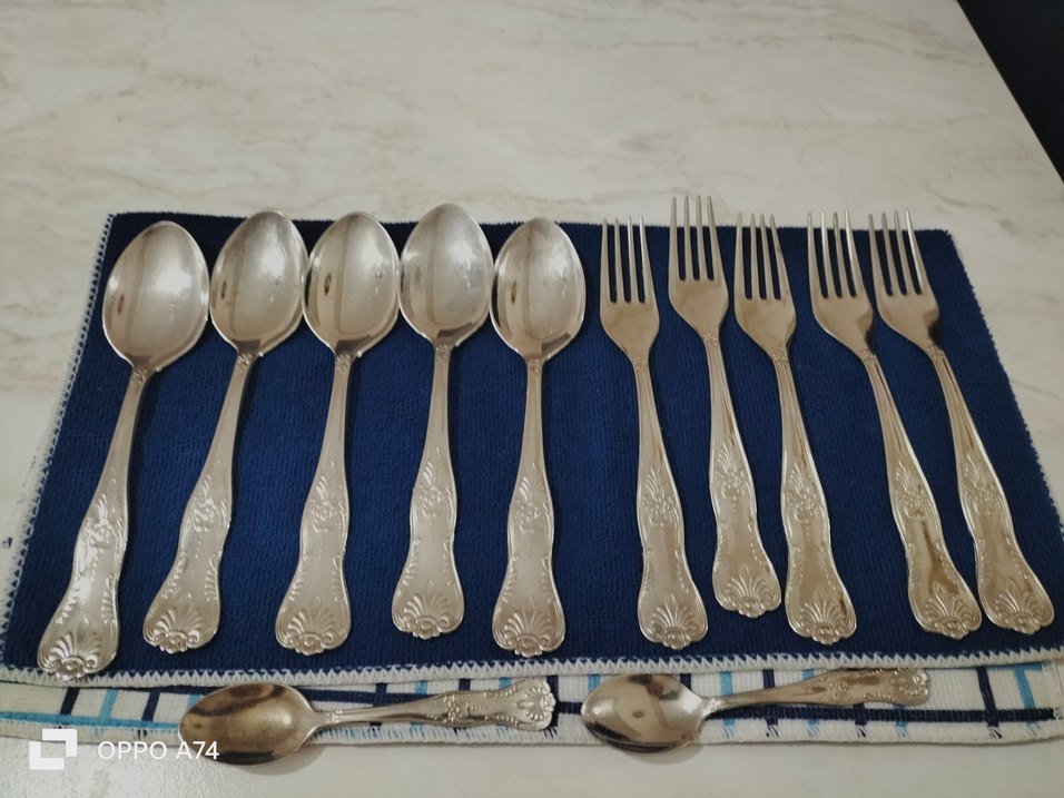 desenli, gümüş renkte 5 adet çatal ve 5 adet kaşık . iki adet tatlı kaşığı. toplamda 12 parça.iyi durumda