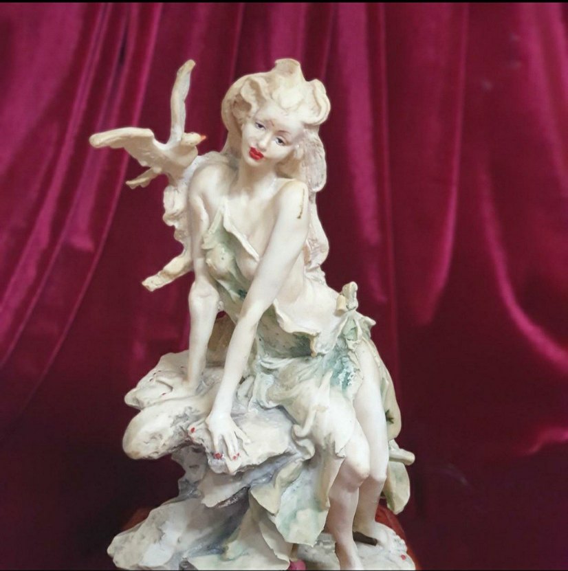 Bu beyaz figürin, yumuşak pastel detaylara sahip narin bir meleği, omuzunda guzel kuşuyla, ahsap bir taban üzerinde zarifçe otururken gösterir. Sakin ve nazik bir ifadeye sahiptir. 33 x 19 cm ölçü Ahsap kaidesinde bir kaç yerinde yopranma var ama rahatsız edici değildir capodimonte porselendir Damgasizdir