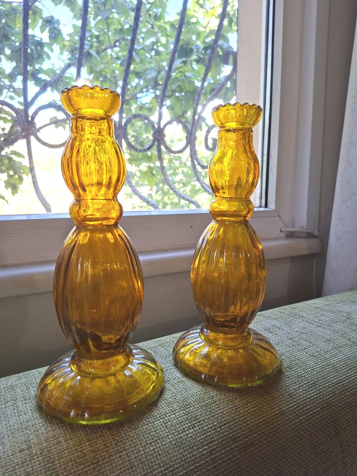 Parlak sarı camdan yapılmış, yuvarlak ve şık tasarıma sahip çift mumluk seti, ek yeri yok , tek parça