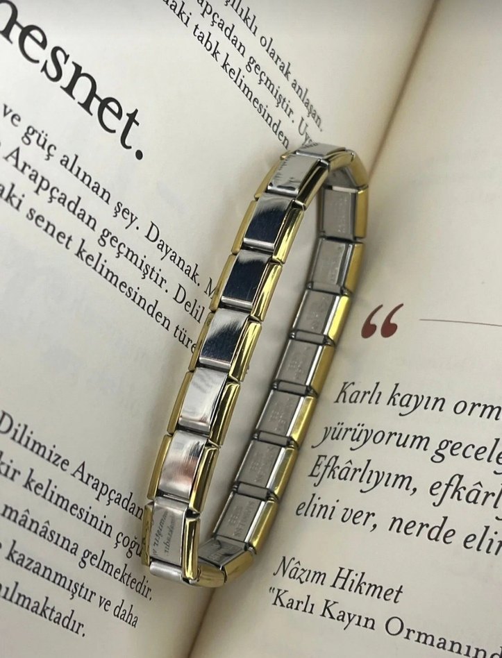Parlak altın renginde, zincir detaylı klasik tarzda, gündelik kullanıma uygun sade ve desen içermeyen bileklik. +3 Charmlıdır. Çeliktir.