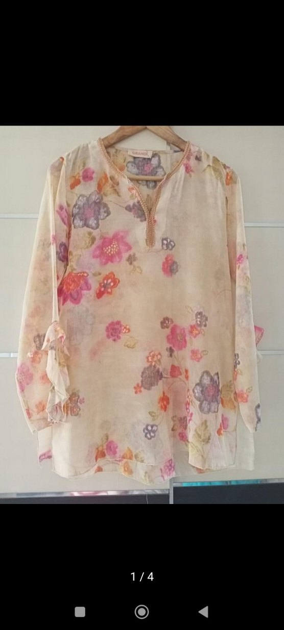 Uzun kollu, V yaka, bol kesim, pastel çiçek desenli bej transparan bohem bluz. Günlük kullanıma uygundur. İtalyan marka. Marka öne çıkarmak için kullanılmıştır.