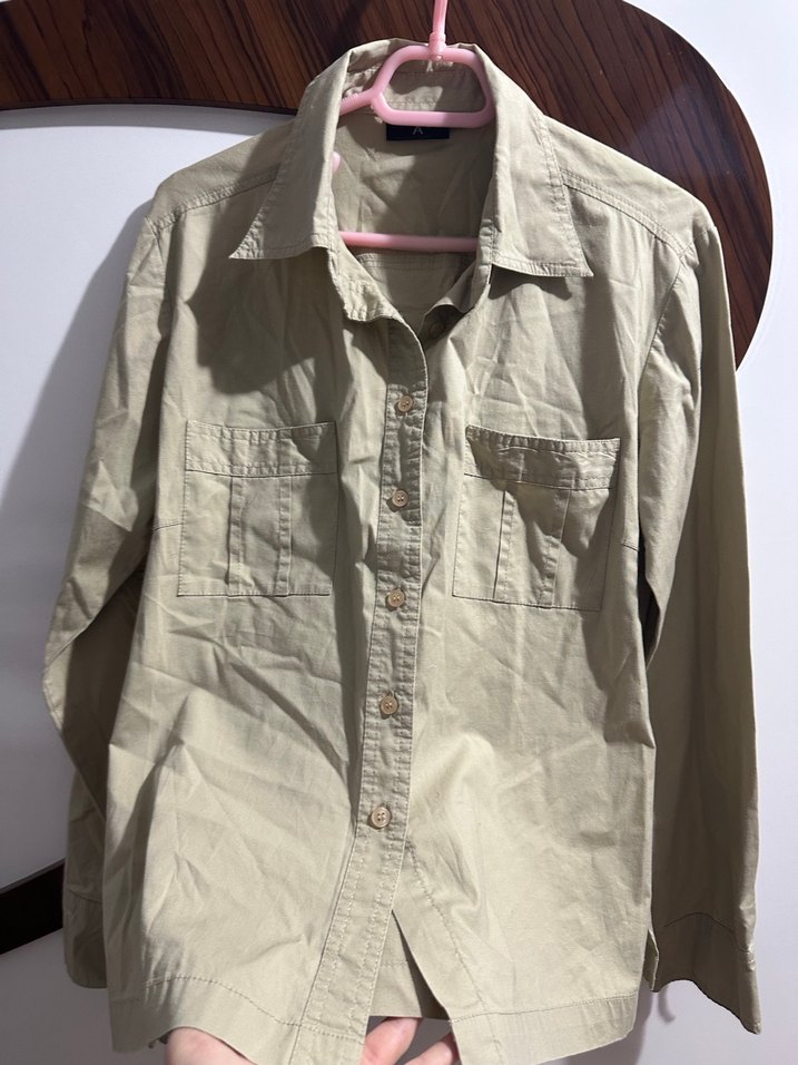Uzun kollu, düğmeli, keten kumaştan yapılmış bej renkli, rahat kesim kadın gömleği. Notlu yaka ve iki göğüs cebi bulunur.