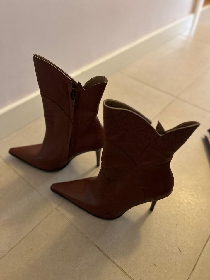 Kemal Tanca, el yapımı, fındık kahve deri, stiletto topuklu kadın bot, vintage ve çağdaş tarz. 10cm topuk yüksekliği, hiç kullanılmamış.