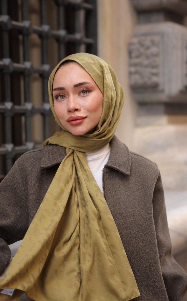 Eskiz kazayagi deseni çiğ badem rengine sahip bu şal, ütü gerektirmeyen, kayma yapmayan, parlak, tok duruşa sahip, mütevazı ve rahat sokak stili için uygundur.
