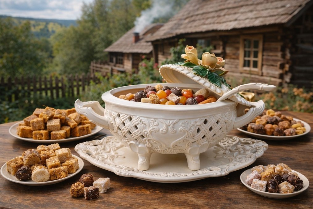 Krema renglu Italyan Kapidamonte seramikten yapılmış, kapağında dev çiçek detayı ve gövdesinde süslü desenler bulunan Tencere-Vazo yanında uyumlu bir tabak ve Kepcesiyle birlikte.