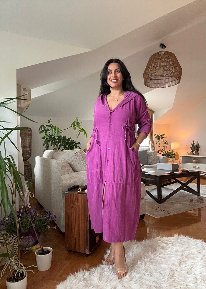 Ürünü Karadağ’dan aldım çok bir İtalyan mağazadan ben o seyahatimde 100 Euro’ya almıştım. Tam sonbaharda kullanılacak en dış tarafı ince kadife yapıda iç tarafı asla rahatsız etmeyecek dümdüz bir kumaş , belindeki Büzgülüler sayesinde dilerseniz belden Büzgülü dilerseniz daha geniş salaş dilerseniz önü açık dilerseniz tamamen kapalı her şekilde kullanabileceğiniz çok özel bir elbise. yine bir kadın markasının tasarımları için arge çalışmalarına özel alınmıştırx hiç giyilmedi. Tek bedendir, s-xl bedene kadar herkese alabilir.
