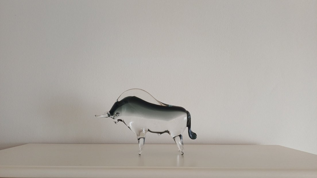 Pürüzsüz kıvrımlara sahip şeffaf gri siyah geçişli cam boğa figürü, zarif işçiliği yansıtıyor.