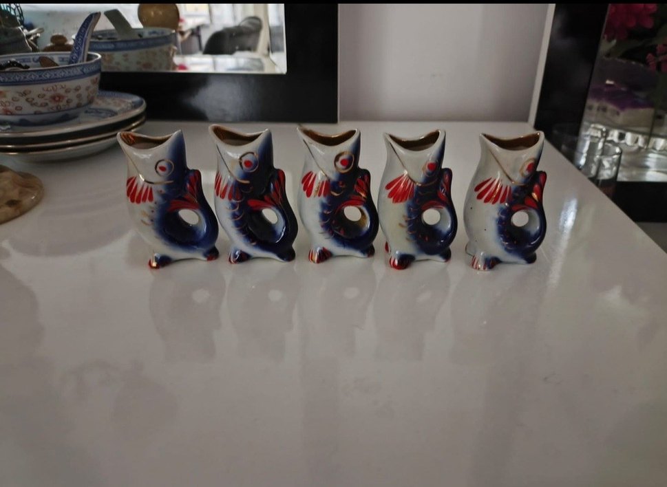 Koyu renkli, kırmızı ve mavi detaylı seramik Italyan Koi balık figürlü vazo seti. Herhangibir sorunu yoktur.