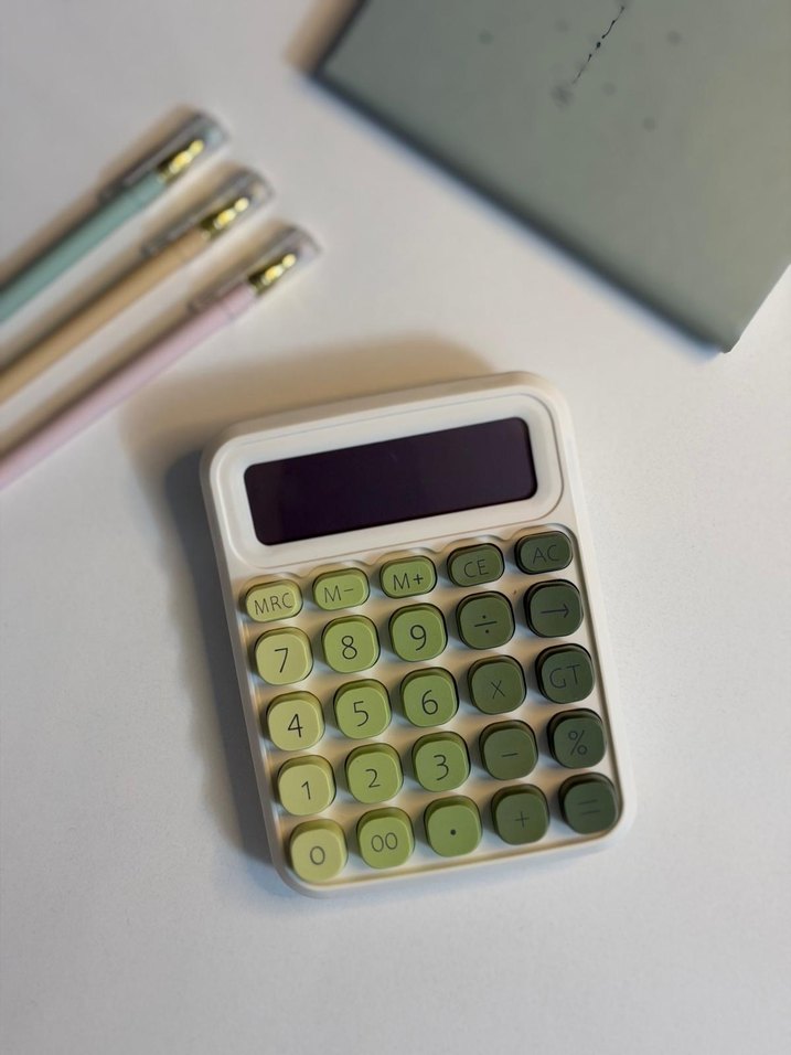 Yuvarlak tuşlara ve net ekrana sahip khaki renkli hesap makinesi, günlük hesaplamalar için uygundur.