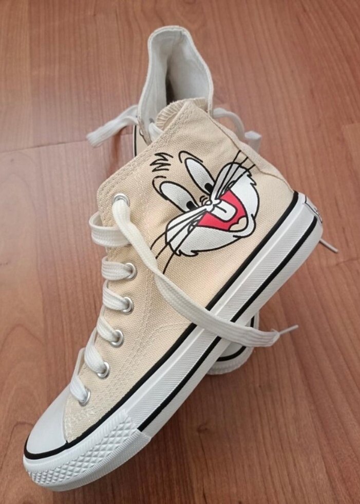 Beyaz renkli, elastik bantlı ve baskılı desenli yüksek topuklu spor ayakkabılar, günlük kullanım için uygun rahat bir sokak stili sunar.