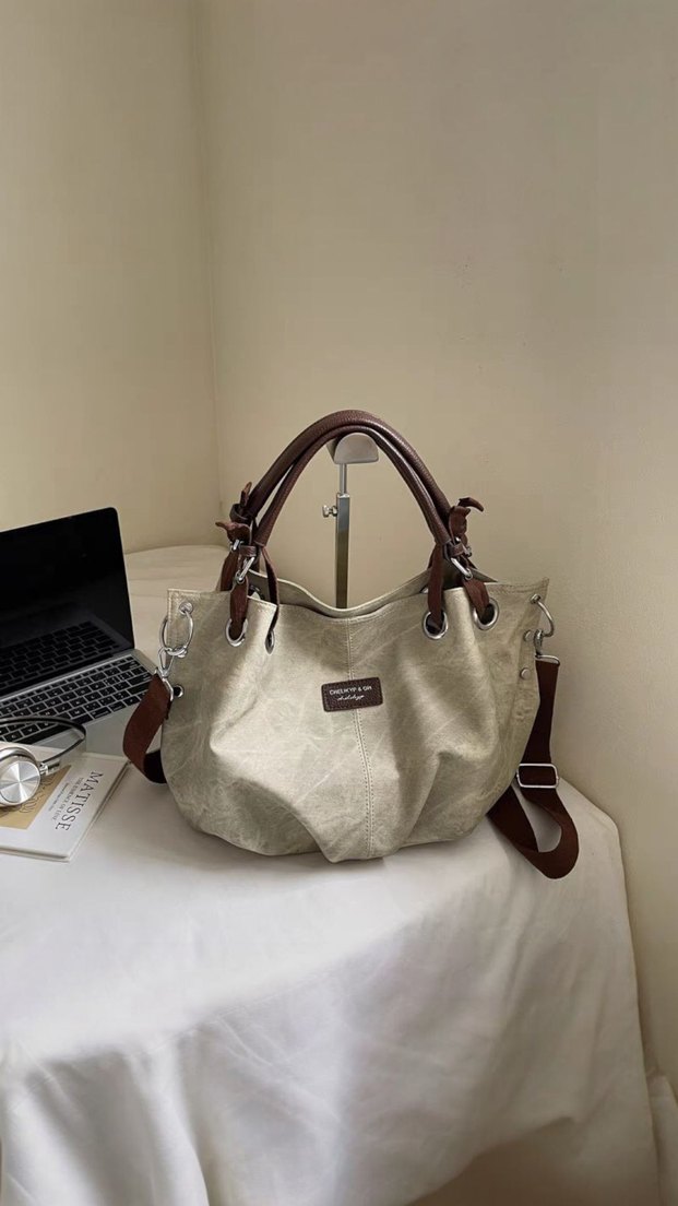 Bej deri kadın çantası, tokalı detaylara ve çağdaş tasarıma sahip, çıkarılabilir omuz askısı bulunur.