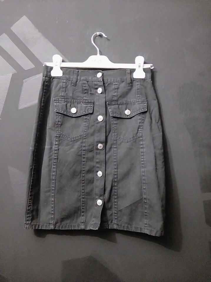 Önden düğmeli ve cepli, siyah denim midi boy, dar kesim etek. Günlük kullanıma uygun, desen içermeyen rahat bir parça.bel 66 cm boy 50 cm alt en 96 cm tam tur