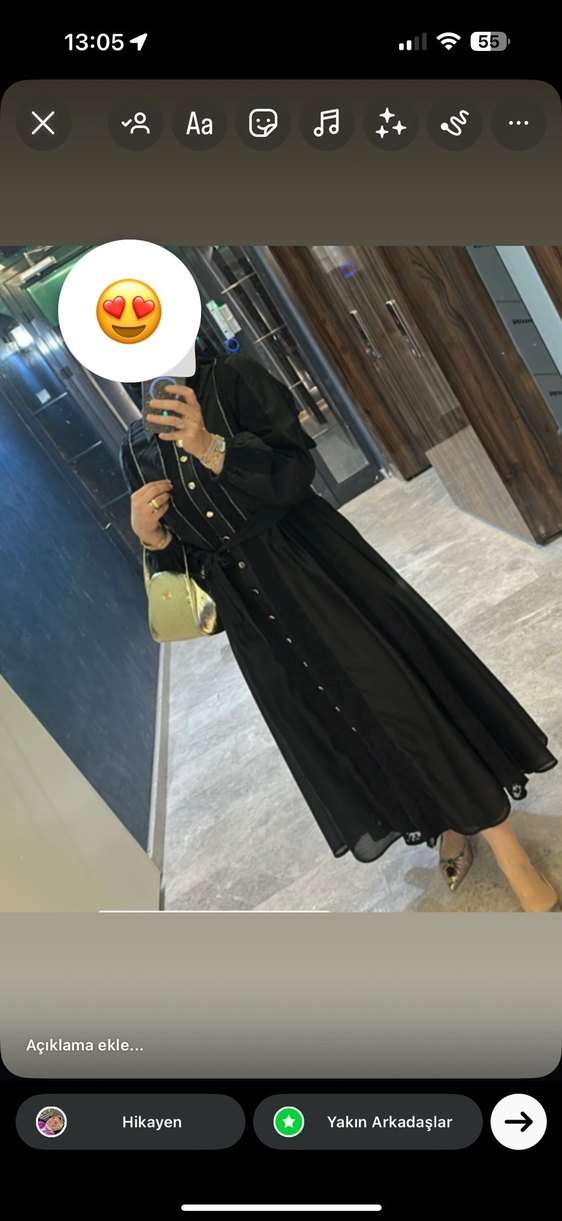 Düğmeli ön kısmı, yüksek yakası ve uzun kollu siyah uzun elbise. Rahat kesimi ve sentetik kumaşıyla gündelik goth tarzını yansıtır.