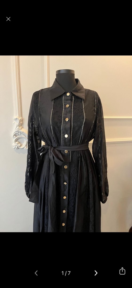 Siyah uzun elbise, düğmeli ön, ipek kumaş ve işleme detaylarına sahiptir. Açık yaka, uzun kollu ve beli kuşaklı, gotik ve klasik şıklığı birleştirir.
