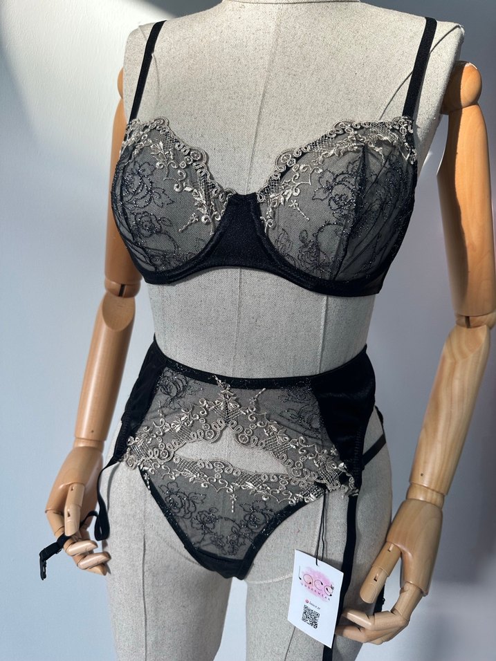 Gri işlemeli kumaş ve siyah detaylarla gotik Parisian tarzında midi uzunlukta sütyen takımı. İnce işlemeler zarif bir görünüm sağlar.